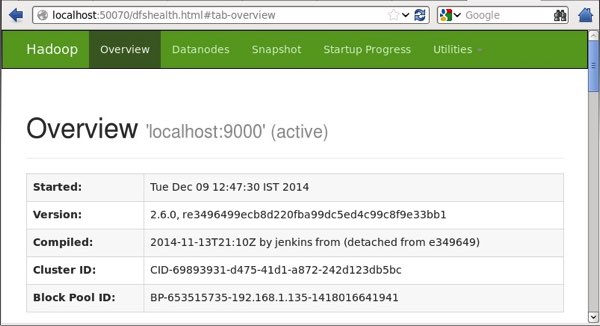 10/24/14 21:37:56 Starting namenodes on [localhost] localhost: starting namenode, logging to /home/hadoop/hadoop-2.4.1/logs/hadoop-hadoop-namenode-localhost.out localhost: starting datanode, logging to /home/hadoop/hadoop-2.4.1/logs/hadoop-hadoop-datanode-localhost.out Starting secondary namenodes [0.0.0.0]