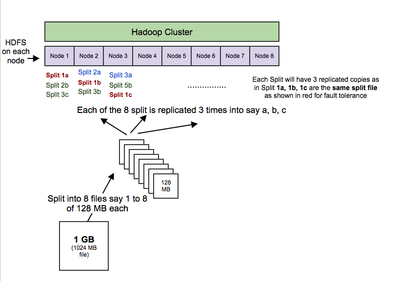128MB文件,并存储在Hadoop集群中的8个不同节点上。每个分裂可以复制3次,以实现容错,以便如果1个节点故障的话,也有备份。HDFS适用于顺序的“一次写入、多次读取”的类型访问。
