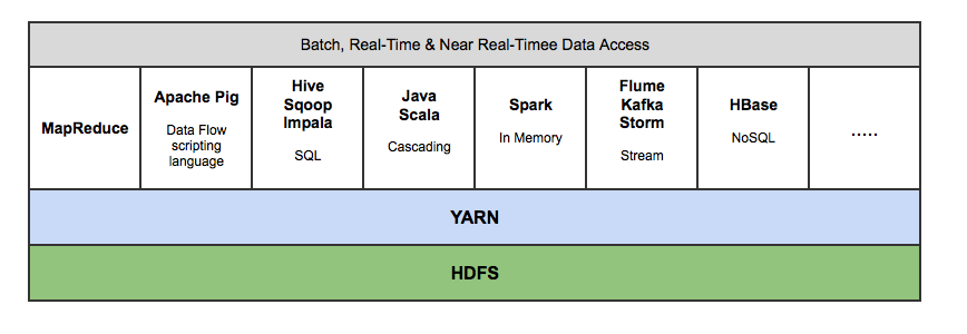 Hadoop生态系统,拥有15多种框架和工具,如Sqoop,Flume,Kafka,Pig,Hive,Spark,Impala等,以便将数据摄入HDFS,在HDFS中转移数据(即变换,丰富,聚合等),并查询来自HDFS的数据用于商业智能和分析。某些工具(如Pig和Hive)是MapReduce上的抽象层,而Spark和Impala等其他工具则是来自MapReduce的改进架构/设计,用于显著提高的延迟以支持近实时(即NRT)和实时处理。