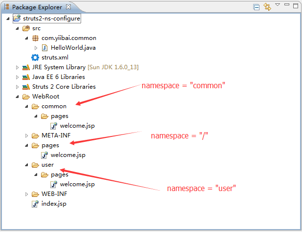 <package name="common" namespace="/common" extends="struts-default"> <action name="SayWelcome"> <result>/common/pages/welcome.jsp</result> </action> </package>
