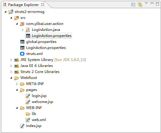 一共有两个属性文件用来存储信息,其中 LoginAction.properties 文件放在 com.yiibai.user.action 包下。