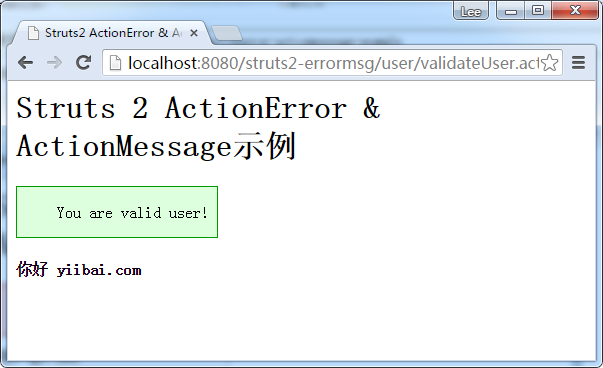 一个经典的动作类,做一个简单的检查,以确认用户名是否等于“yiibai.com",并使用 addActionError()设置错误信息或addActionMessage()设置成功的消息。