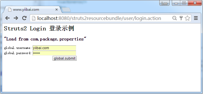 国际化i18n 标签可以从“name”属性声明指定资源包得到消息。在这个例子中,它要求从com/yiibai/user/package.properties文件中以获得 “username” 的消息。
