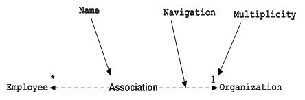 联合会(无)两侧的箭头的虚线表示。两端代表两个相关联的元素,如下所示。在两端(1,*等)的多样性也提到多少对象相关。