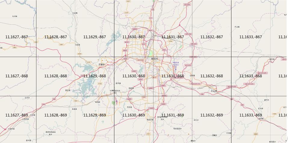 地图加载完毕后会在页面中看见每张瓦片的网格信息,每张瓦片上都有三个参数,这三个参数分别表示地图的缩放级别、行号和列号