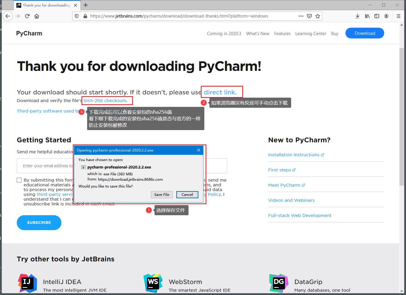 这个页面不要关闭,因为等下载完成后我们需要验证下安装包的SHA256值,这是为了验证安装包是不是被动过手脚(这就是安全下载的原因)