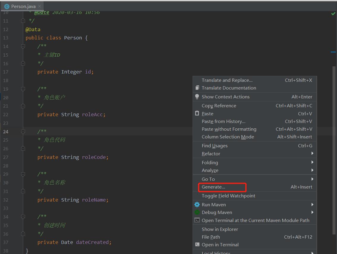 在实体累对象中,点击鼠标右键,选择Generate,再点击generate mybatis files