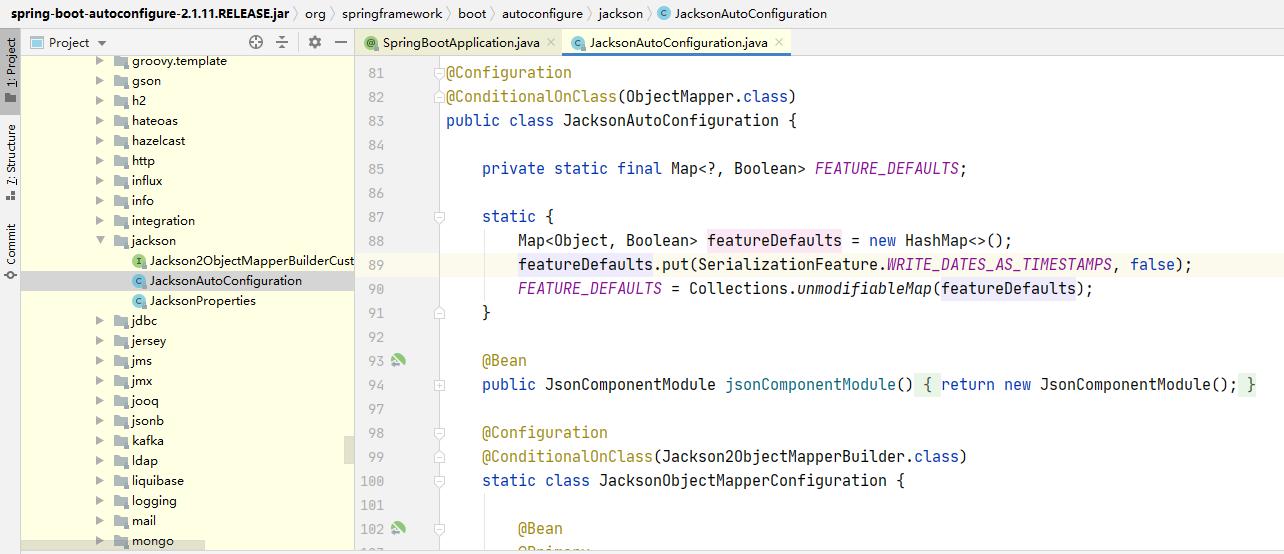 由于Spring Boot的自动配置JacksonAutoConfiguration中有如下图所示的依赖引入和配置,所以不需要我们额外配置