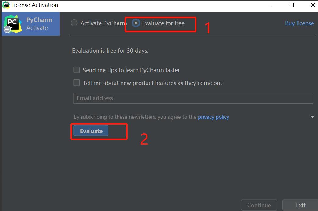1. 安装完成启的IDE,如果上来就需要注册,选择:试用(Evaluate for free)进入IDE。