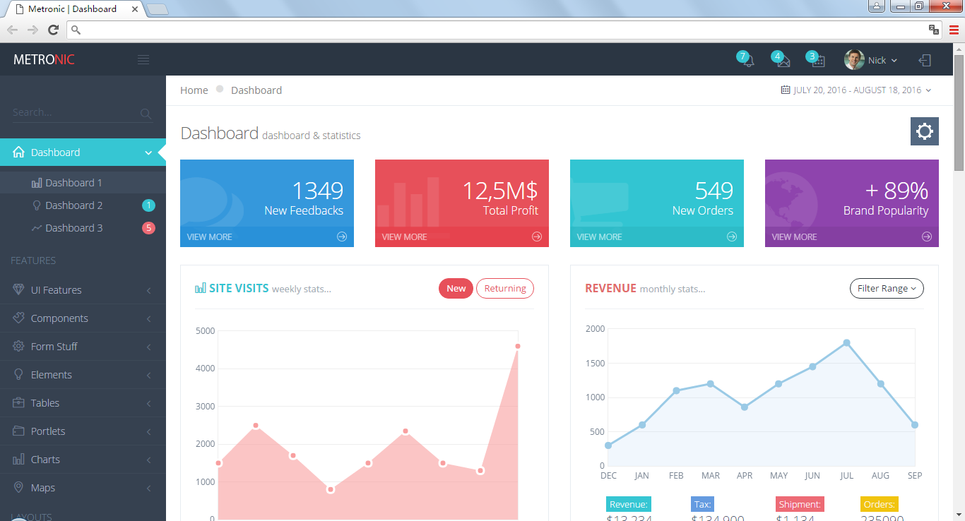 整体感觉与Metronic类似、功能强大,UI精致,被许多公司使用。