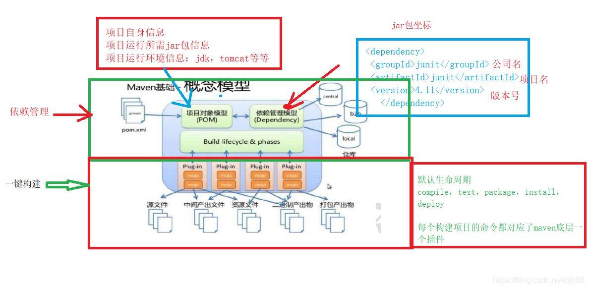 通过图解可以发现maven工程不直接将jar包导入到工程中,而是通过再pom.xml中添加所需的jar包的坐标,这样就避免了jar直接引入进来,在需要用到jar包的时候,只要查找pom.xml文件,再通过pom.xml中的坐标,到一个专门用于存放jar包的仓库中根据坐标从而找到这些jar包,再把这些jar包拿去运行