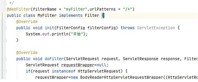 <!--定义过滤器--> <filter> <!--定义过滤器拦截URL地址--> <filter-name>test2</filter-name> <!--过滤器的文件--> <filter-class>com.zhhy.hy2000interface.utils.filter.MyFilter</filter-class> </filter> <filter-mapping> <!--过滤器的名称--> <filter-name>test2</filter-name> <!--过滤器负责拦截的URL--> <!-- /* 会把所有的请求拦截下来 --> <url-pattern>/*</url-pattern> </filter-mapping>