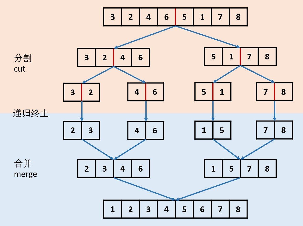 利用归并排序,我们可以将时间复杂度降至O(nlogn), 并且我们是对链表进行排序,可以通过修改引用来更改节点顺序,无需像数组一样开辟而外的空间。