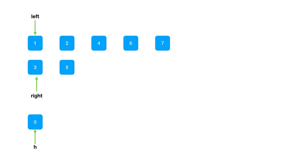 // left 为前链表的头节点, right 为后链表的头节点, h 为辅助节点