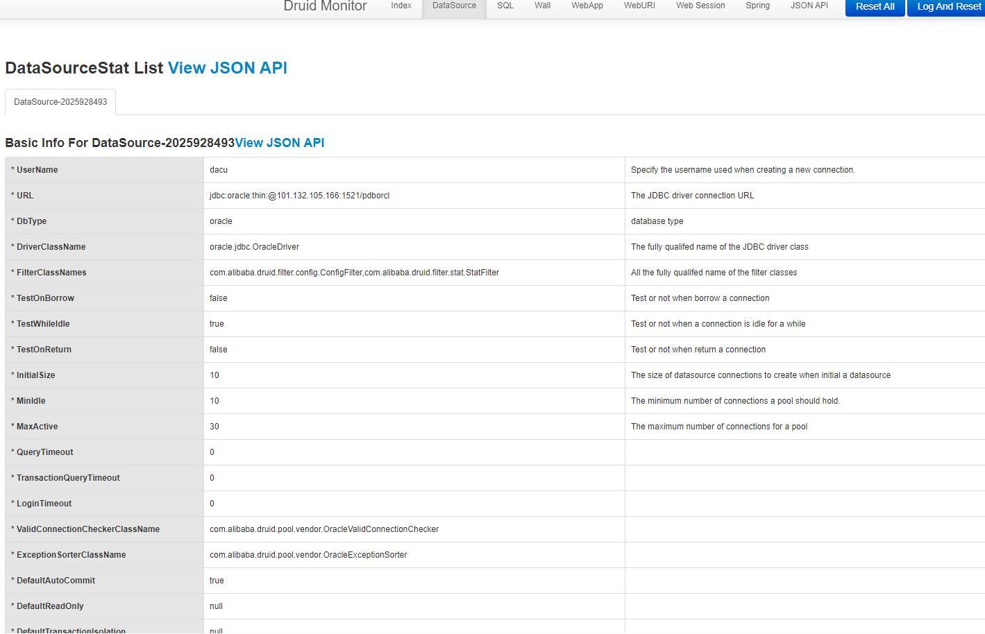 # Druid连接池配置,官方配置参考:https://github.com/alibaba/druid/tree/master/druid-spring-boot-starter spring.datasource.url=jdbc:mysql://localhost:3306/test?serverTimezone=Asia/Shanghai spring.datasource.username=root spring.datasource.password=123456 spring.datasource.driver-class-name=com.mysql.cj.jdbc.Driver spring.datasource.type=com.alibaba.druid.pool.DruidDataSource # Druid其他配置 spring.datasource.druid.initial-size=5 spring.datasource.druid.max-active=20 spring.datasource.druid.min-idle=10 spring.datasource.druid.max-wait=10 spring.datasource.druid.filters=stat,wall spring.datasource.druid.filter.stat.log-slow-sql=true spring.datasource.druid.filter.stat.slow-sql-millis=2000 # Druid WebStatFilter配置,说明请参考Druid Wiki,配置_配置WebStatFilter spring.datasource.druid.web-stat-filter.enabled=true spring.datasource.druid.web-stat-filter.url-pattern=/* spring.datasource.druid.web-stat-filter.exclusions=*.gif,*.png,*.jpg,*.html,*.js,*.css,*.ico,/druid/* # Druid StatViewServlet配置,说明请参考Druid Wiki,配置_StatViewServlet配置 spring.datasource.druid.stat-view-servlet.enabled=true spring.datasource.druid.stat-view-servlet.url-pattern=/druid/* spring.datasource.druid.stat-view-servlet.reset-enable=true spring.datasource.druid.stat-view-servlet.login-username=admin spring.datasource.druid.stat-view-servlet.login-password=admin spring.datasource.druid.stat-view-servlet.allow= spring.datasource.druid.stat-view-servlet.deny=