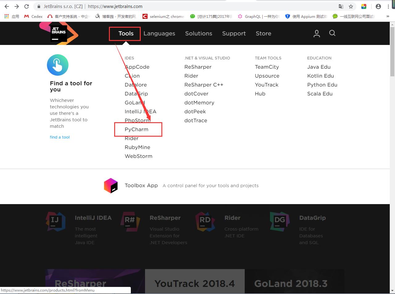 第一步:进入PyCharm官网,点击Tools,如下图所示: