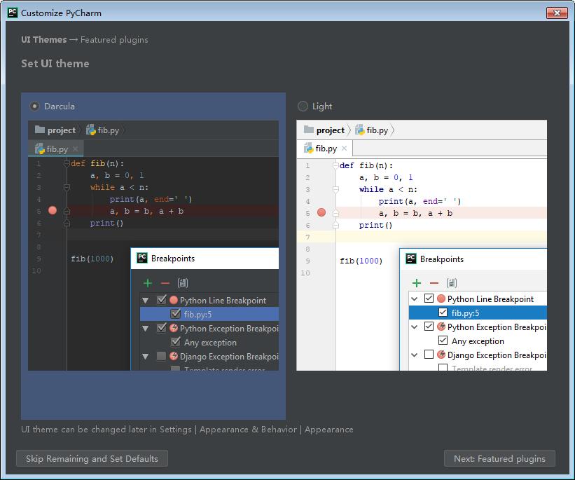 皮肤选择,建议选择Darcula主题,该主题更有利于保护眼睛,而且看上去也非常不错~~~