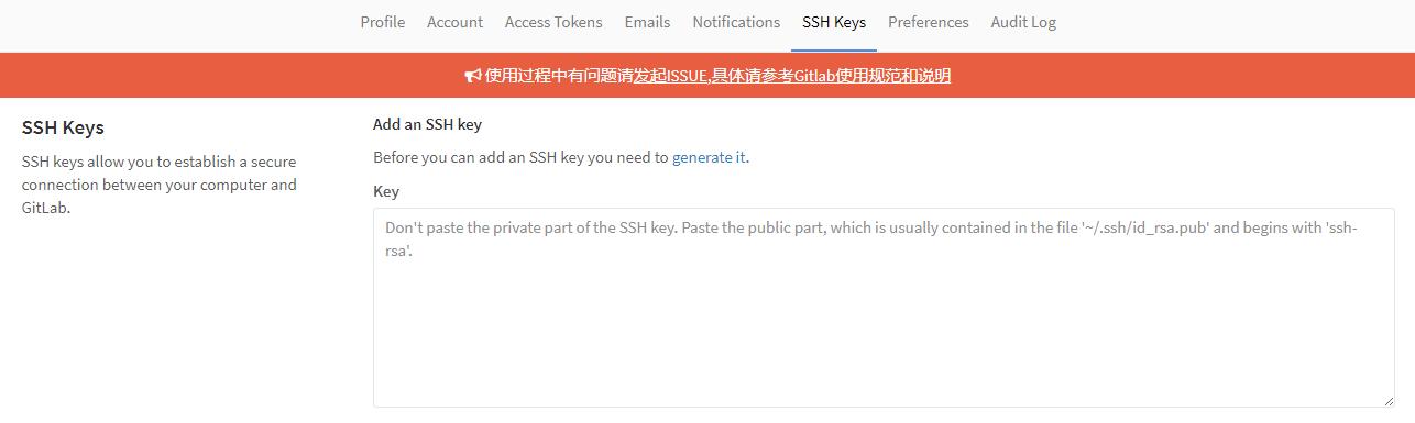 所以可以通过创建ssh key 并将产生的id_rsa.pub的内容加到gitlab的后台就可以解决问题了。