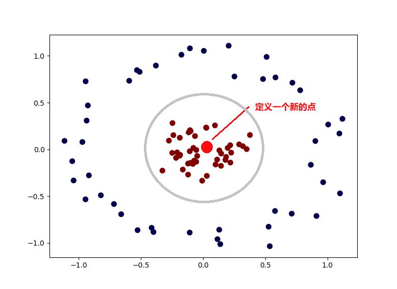 这种时候就可以使用核函数,将数据转换一下,比如这里,我们手动定义了一个新的点,然后对所有的数据,计算和这个新的点的欧式距离,这样我们就得到一个新的数据。而其中,离这个新点距离近的数据,就被归为一类,否则就是另一类。这就是核函数。