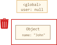现在 John 变成不可达的状态,没有办法访问它,没有对它的引用。垃圾回收器将丢弃 John 数据并释放内存。
