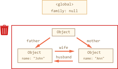 “family”对象已经从根上断开了链接,不再有对它的引用,因此下面的整个块变得不可到达,并将被删除。