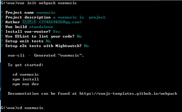 安装成功后在项目文件夹下 运行 vue init webpack + 项目名: