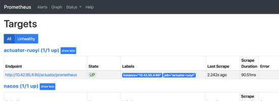 - job_name: 'actuator-ruoyi' # metrics_path defaults to '/metrics' # scheme defaults to 'http'. metrics_path: '/actuator/prometheus' static_configs: - targets: ['10.42.95.4']
