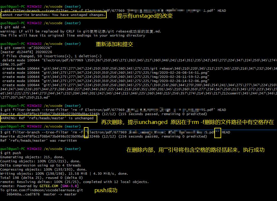 $ git filter-branch --tree-filter 'rm -f "Electron/pdf/677969 xxxx xxx.pdf"' HEAD Rewrite d1244f8fbc1f08b473bd498c023b09bd8ac3246b (12/12) (156 seconds passed, remaining 0 predicted) Ref 'refs/heads/master' was rewritten