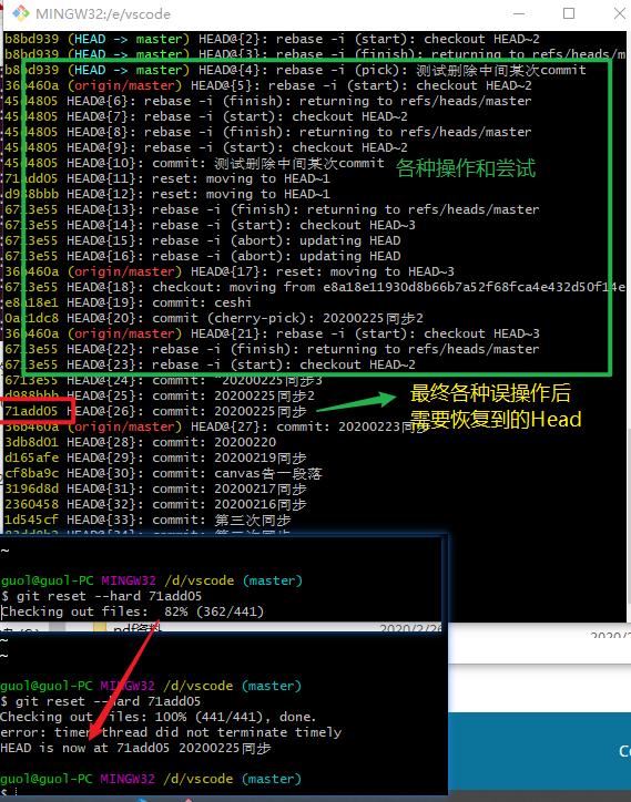如上,可以直接看到需要恢复到的commit ID是多少。比如恢复到Id为71add05的时刻,执行git reset --hard 71add05等待恢复。本地仓库和文件就能恢复到指定提交时刻。