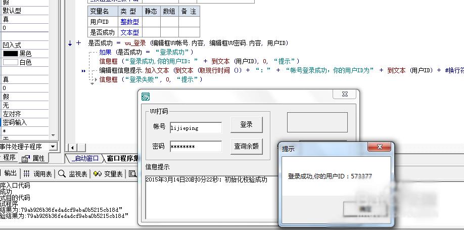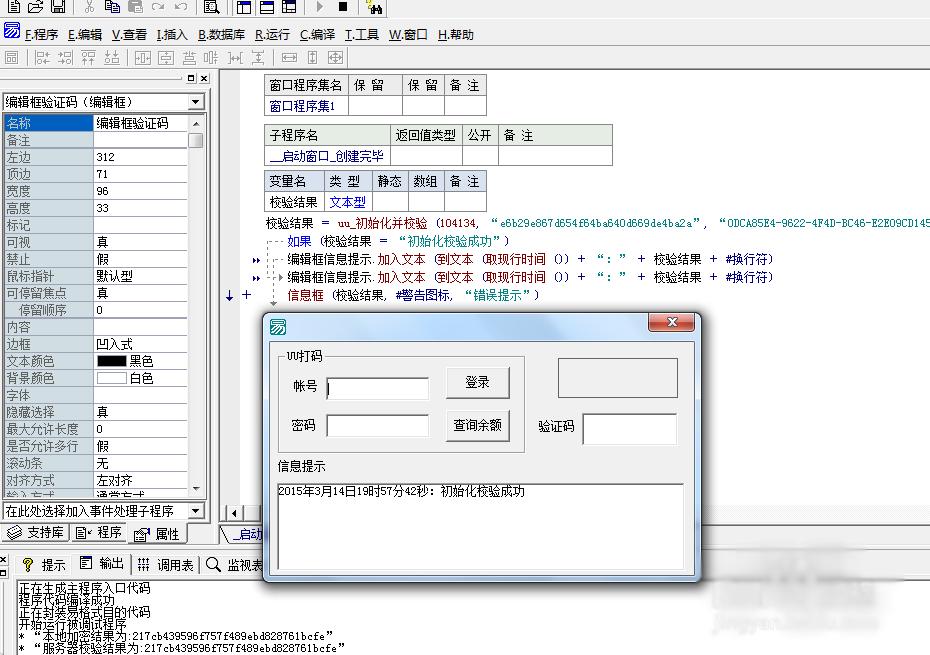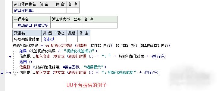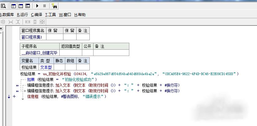 8、获取校验码后,在__启动窗口_创建完毕,我们就开始校验,添加如下代码!当然也可以参考UU平台提供的例子,都是比较容易的!可以运行一下,是否验证成功!