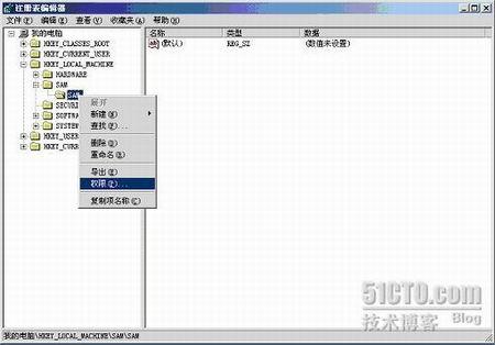 SAM是保存用户帐号的地方,不过这个“项”在默认情况下是不可见的。我们如果想看内部的内容就必须首先对其授权。(建议对注册表不是很熟悉的朋友不要随便改动注册表)