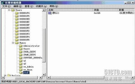 在OS中的用户帐号无论是内置帐号,还是后建帐号,在注册表中都能看见。不过有两个帐号大家一定要能够认识,那就是管理员帐号和guest帐号。(如下图)