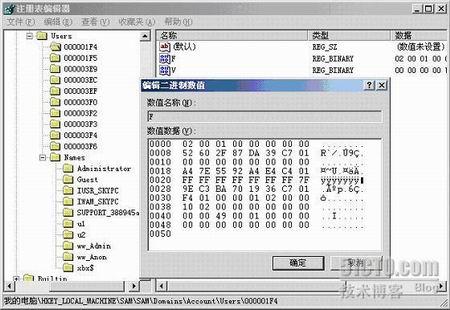 找到HKEY_LOCAL_MACHINE\SAM\SAM\Domains\Account\Users 这个项,打开”000001f4”项,然后再打开”F”(如下图)。