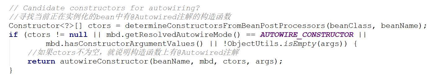 AutowiredAnnotationBeanPostProcessor 类的方法, 在方法中会扫描有注解的构造函数然后完成装配过程。 然后把有有@Autowired 注解的构造函数返回。