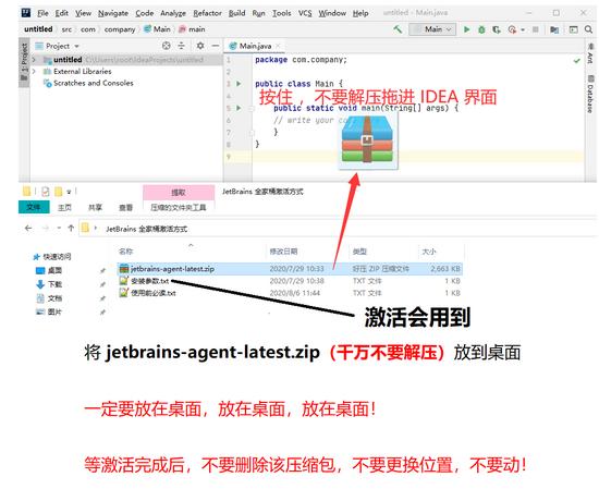 7、 将下面公众号,回复“20202” 得到的 2020 版本文件夹中的激活补丁 jetbrains-agent-latest.zip拖入 IDEA 界面中
