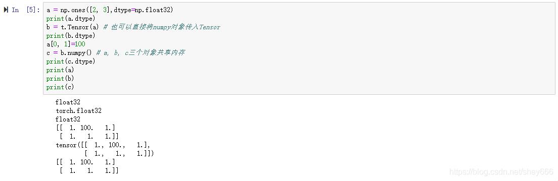 2. Torch的Tensor和numpy的array会共享他们的存储空间,修改一个会导致另外的一个也被修改。