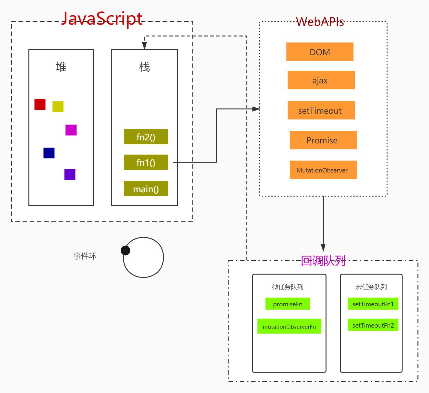 JS 中所有的方法都会被推入栈中执行,执行完成被弹出,在遇到异步代码的时候,例如 setTimeout MutationObserver Promise 异步的部分会由其他掌管 webAPI 的地方执行,等异步有结果之后,回调函数会进入相应的队列,Promise MutationObserver 回调进入微任务队列,setTimeout setInterval requestAnimationFrame 进入宏任务队列。等待主线程的执行栈空了,微任务队列立刻被推入栈中执行,执行完毕开始执行宏任务队列