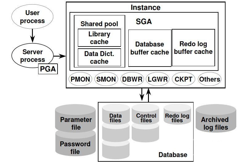 Oracle数据库服务器由一个数据库和至少一个数据库实例组成。 数据库是一组存储数据的文件,而数据库实例是一组管理数据库文件的内存结构。 另外,数据库由后台进程组成。