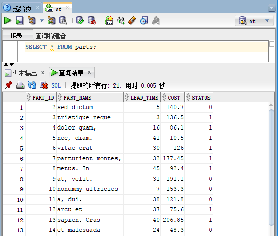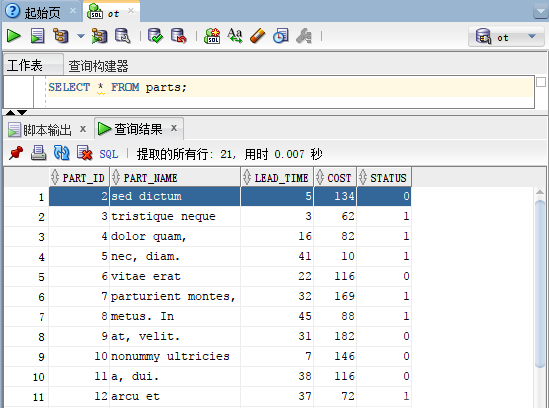 -- oracle 11g的插入数据写法 INSERT INTO parts (part_id,part_name,lead_time,cost,status) VALUES (parts_seq.nextval,'sed dictum',5,134,0); INSERT INTO parts (part_id,part_name,lead_time,cost,status) VALUES (parts_seq.nextval,'tristique neque',3,62,1); INSERT INTO parts (part_id,part_name,lead_time,cost,status) VALUES (parts_seq.nextval,'dolor quam,',16,82,1); INSERT INTO parts (part_id,part_name,lead_time,cost,status) VALUES (parts_seq.nextval,'nec, diam.',41,10,1); INSERT INTO parts (part_id,part_name,lead_time,cost,status) VALUES (parts_seq.nextval,'vitae erat',22,116,0); INSERT INTO parts (part_id,part_name,lead_time,cost,status) VALUES (parts_seq.nextval,'parturient montes,',32,169,1); INSERT INTO parts (part_id,part_name,lead_time,cost,status) VALUES (parts_seq.nextval,'metus. In',45,88,1); INSERT INTO parts (part_id,part_name,lead_time,cost,status) VALUES (parts_seq.nextval,'at, velit.',31,182,0); INSERT INTO parts (part_id,part_name,lead_time,cost,status) VALUES (parts_seq.nextval,'nonummy ultricies',7,146,0); INSERT INTO parts (part_id,part_name,lead_time,cost,status) VALUES (parts_seq.nextval,'a, dui.',38,116,0); INSERT INTO parts (part_id,part_name,lead_time,cost,status) VALUES (parts_seq.nextval,'arcu et',37,72,1); INSERT INTO parts (part_id,part_name,lead_time,cost,status) VALUES (parts_seq.nextval,'sapien. Cras',40,197,1); INSERT INTO parts (part_id,part_name,lead_time,cost,status) VALUES (parts_seq.nextval,'et malesuada',24,46,0); INSERT INTO parts (part_id,part_name,lead_time,cost,status) VALUES (parts_seq.nextval,'mauris id',4,153,1); INSERT INTO parts (part_id,part_name,lead_time,cost,status) VALUES (parts_seq.nextval,'eleifend egestas.',2,146,0); INSERT INTO parts (part_id,part_name,lead_time,cost,status) VALUES (parts_seq.nextval,'cursus. Nunc',9,194,1); INSERT INTO parts (part_id,part_name,lead_time,cost,status) VALUES (parts_seq.nextval,'vivamus sit',37,93,0); INSERT INTO parts (part_id,part_name,lead_time,cost,status) VALUES (parts_seq.nextval,'ac orci.',35,134,0); INSERT INTO parts (part_id,part_name,lead_time,cost,status) VALUES (parts_seq.nextval,'arcu. Aliquam',36,154,0); INSERT INTO parts (part_id,part_name,lead_time,cost,status) VALUES (parts_seq.nextval,'at auctor',32,56,1); INSERT INTO parts (part_id,part_name,lead_time,cost,status) VALUES (parts_seq.nextval,'purus, accumsan',33,12,1);