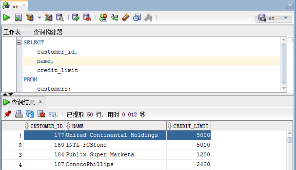 以下示例显示如何从客户(customers)表的customer_id,name和credit_limit列中查询数据。