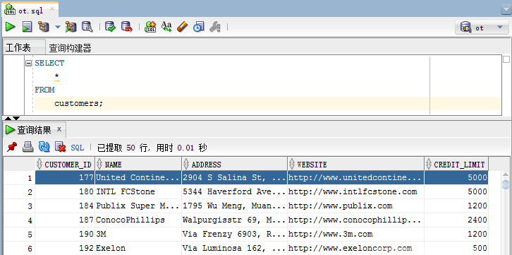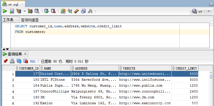在Oracle中,表是由列和行组成。 例如,示例数据库中的customers表具有以下列:customer_id,name,address,website和credit_limit。customers表中这些列中也有对应的数据。
