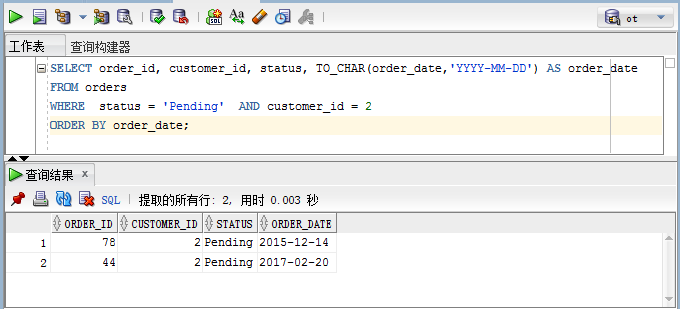 以下示例查找具有客户编号为2的那些状态为挂起(Pending)的订单: