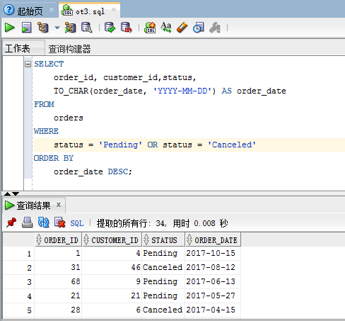 以下示例查找状态为挂起(Pending)或取消(Canceled)的订单,参考以下查询语句 -