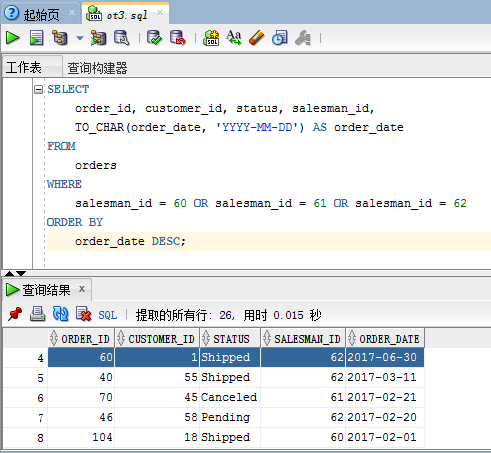 我们经常使用OR运算符来组合两个以上的布尔表达式。 例如,以下语句检索负责以下销售员ID是60,61或62的订单: