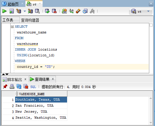 对于每个仓库,子查询检查其位置是否在美国(US)。如果是,则WHERE子句中的EXISTS运算符返回true,使外部查询将字符串",USA"附加到仓库名称。否则,由于条件是WHERE子句为false,UPDATE语句将什么都不做。