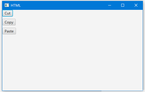 VBox vbox = new VBox(8); // spacing = 8 vbox.getChildren().addAll(new Button("Cut"), new Button("Copy"), new Button("Paste"));完整的实现代码如下所示 -import javafx.application.Application; import javafx.scene.Group; import javafx.scene.Scene; import javafx.scene.control.Button; import javafx.scene.layout.VBox; import javafx.stage.Stage; public class Main extends Application { @Override public void start(final Stage stage) { stage.setTitle("HTML"); stage.setWidth(500); stage.setHeight(500); Scene scene = new Scene(new Group()); VBox vbox = new VBox(8); // spacing = 8 vbox.getChildren().addAll(new Button("Cut"), new Button("Copy"), new Button("Paste")); scene.setRoot(vbox); stage.setScene(scene); stage.show(); } public static void main(String[] args) { launch(args); } }