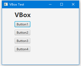 VBox布局将子节点堆叠在垂直列中。新添加的子节点被放置在上一个子节点的下面。默认情况下,VBox尊重子节点的首选宽度和高度。