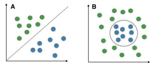 当然图像A是最理想、也是最简单的一种二分类问题,但是现实中往往存在一些非常复杂的线性不可分问题,比如图像B,你是找不到任何一条直线可以将图像B中蓝点和绿点完全分开的,你必须圈出一个封闭曲线。