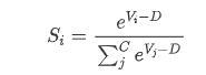 为了防止SoftMax函数计算时出现上溢出或者下溢出的问题,通常会提前对 V 做一些数值处理,即每个 V 减去 V 中的最大值,假设D=max(V),SoftMax函数数学表达式更改为: