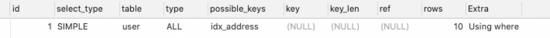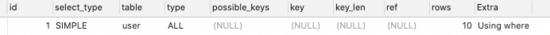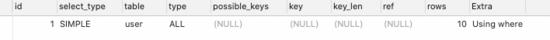 可以通过分析SQL看到,type类型是ALL,扫描了10行数据,进行了全表扫描。<>也是同样的结果。